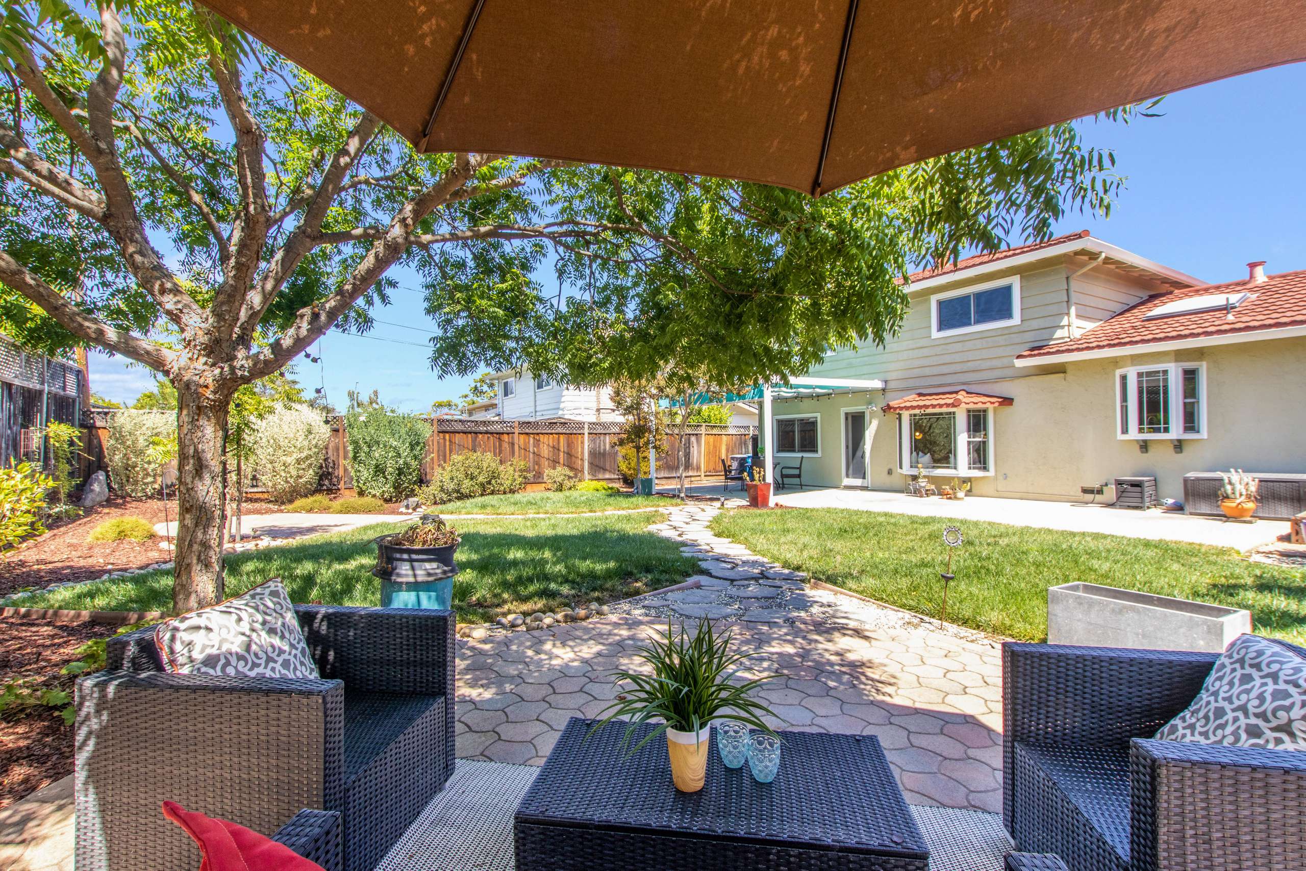 4 bed 2.5 bath, 1,782 sf home on an expansive 7,606 sf lot in the highly central Vallco Center neighborhood of Cupertino. This 2-story east facing home on a quiet cul de sac street features new carpet, paint, and finishes. The front entryway opens to a spacious living area the ample natural light and a wood burning fireplace. Dining room features custom bay window with recessed lighting and the chef’s kitchen features a breakfast nook, corian countertops, undercabinet lighting, and natural light via overhead skylight and bay window. Family room area with adjacent office provides perfect gathering area complete with a seated bay window and energy efficient mini split ductless cooling. Second floor features primary bedroom with dual closets and two additional bedrooms each with energy efficient ductless mini split systems. Parklike backyard with 3 patio areas, 2 storage sheds, and retractable awning by ShadeTree provides perfect backdrop for enjoying the outdoors. Rachio smart water system provides ease of maintenance for drought tolerant plants and numerous fruit trees including, blueberries, meyer lemons, seedless limes, and blackberries.