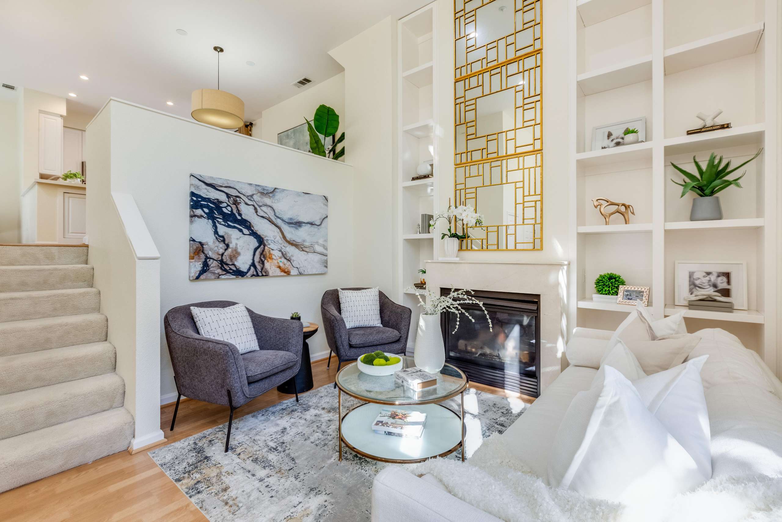 Modern finishes include beautiful laminate flooring, cozy gas fireplace, dimmable recessed lighting throughout, Nest thermostat, Nest smoke detector, and double pane windows. The remodeled kitchen is complete with white cabinets, quartz countertops, tiled backsplash, and a spacious dining area that overlooks the open living room. Updated bathrooms with new light fixtures and mirrors. Additional features include central heating and AC, attached two-car garage with washer and dryer, and master walk-in closet with custom built-ins.