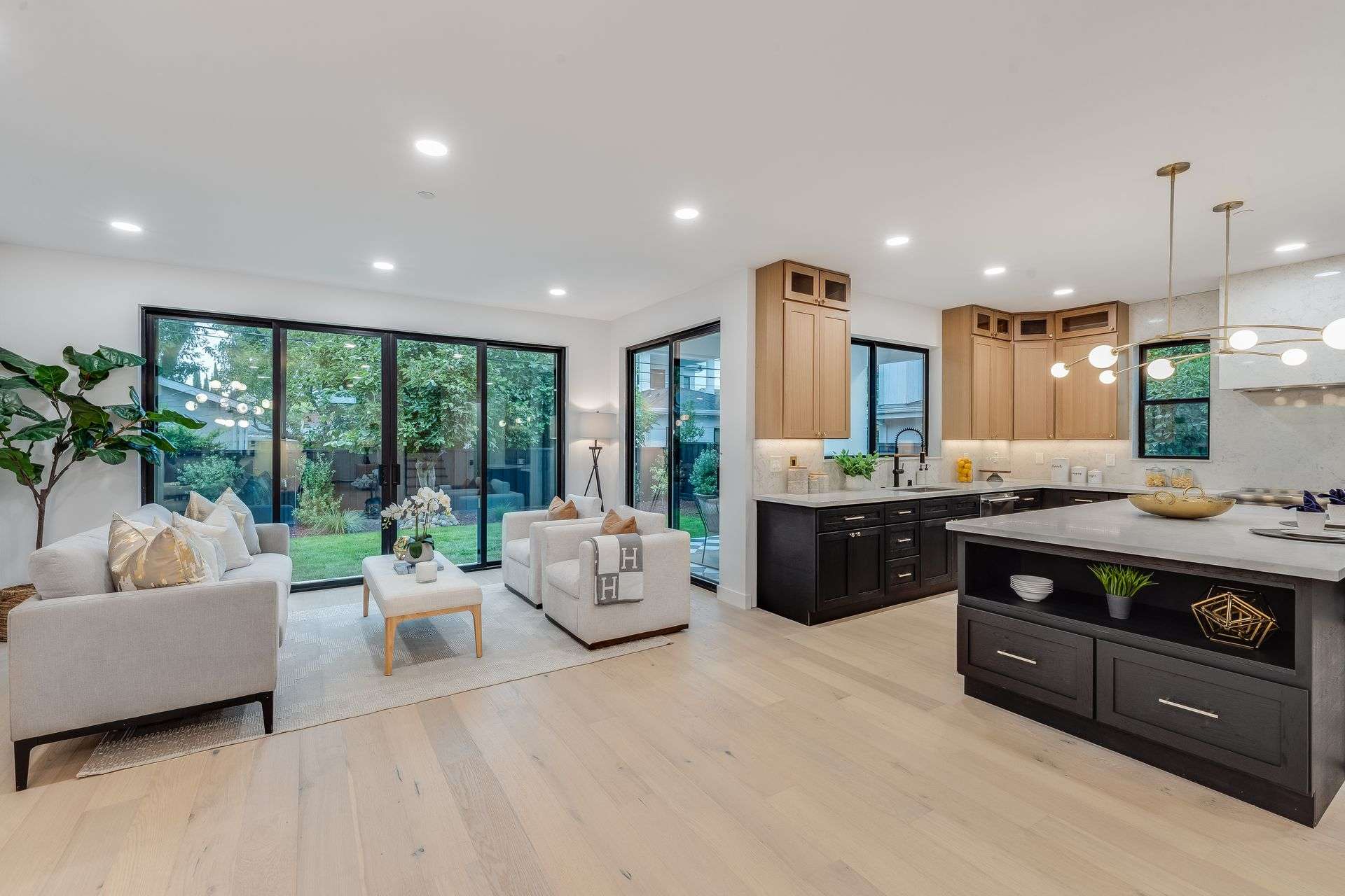 White oak hardwood floors with herringbone detail set the tone at the entry, opening to 9-foot ceilings, recessed lighting, and sophisticated brass accents throughout. Quartz countertops and backsplashes elevate the kitchen and wet areas, while satin brass fixtures, toggles, and Kohler water systems add warmth and refinement.