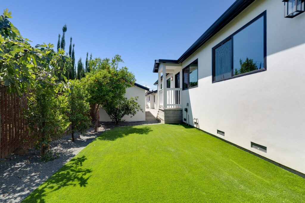 Low-maintenance turf, fruit trees, and a detached garage/studio create usable, tidy spaces with room to entertain. A long driveway provides ample off-street parking.