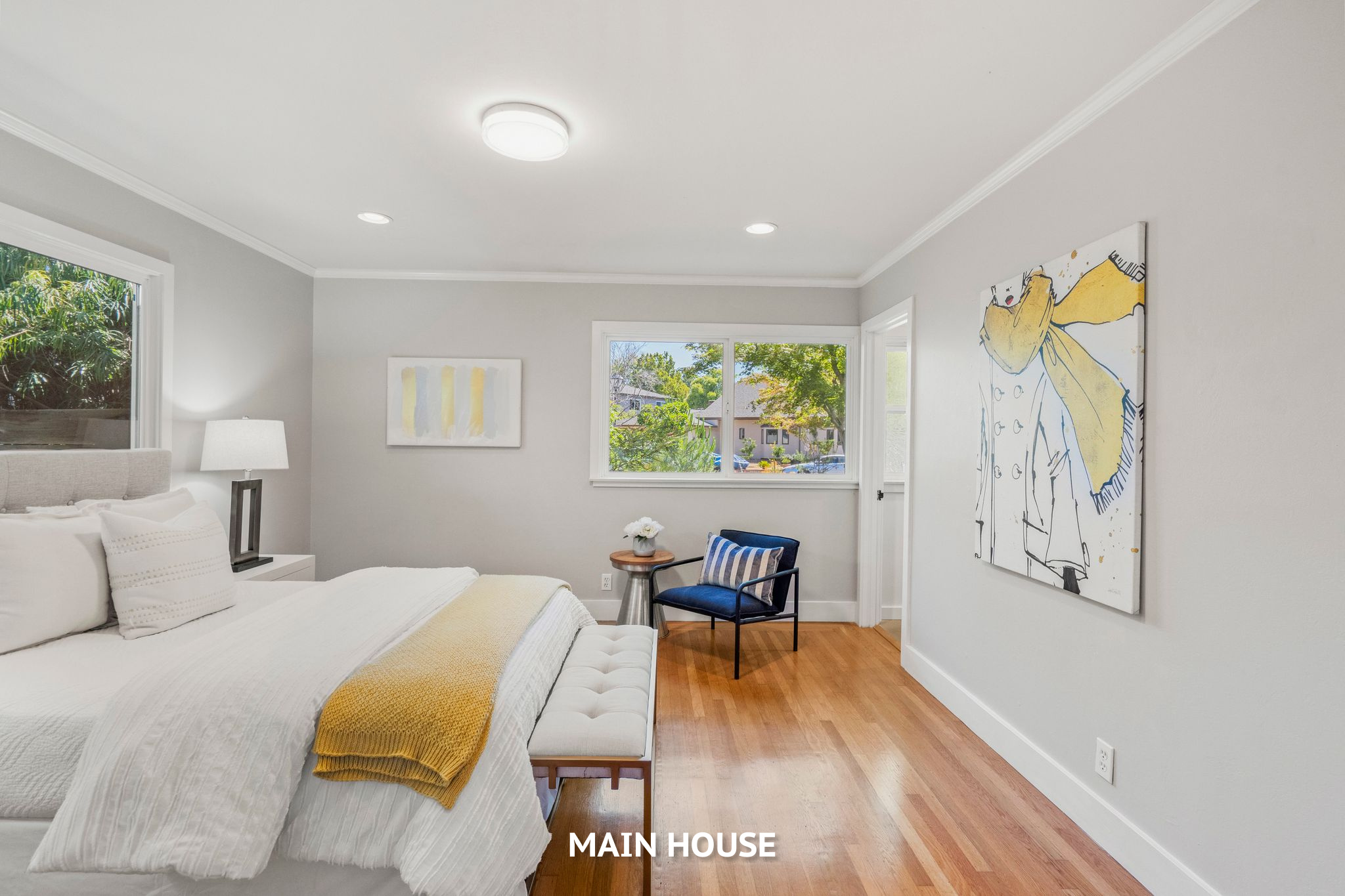 Gunn High School. Main house has hardwood floors throughout, a spacious living and dining room area with ample natural light, custom French doors, built-in bookshelves, recessed lighting, and designer crown molding. The modern kitchen has a breakfast bar, quartz countertops, a garden window, a sink with a designer faucet, stainless steel appliances, a prep sink, and ample cabinet storage. The bedrooms and bathrooms feature custom Heath tiles from Sausalito. The primary suite has reach-in and walk-through closets, recessed lighting, custom baseboards, dual sinks, a custom vanity, tiled floors, and a separate water closet.