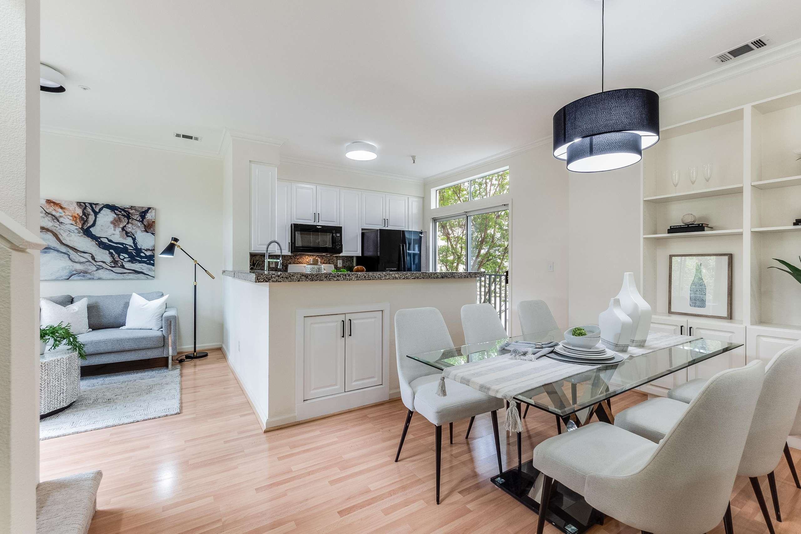 Gorgeous updated townhome situated in sought after Whisman Station neighborhood in Mountain View. Desirable and efficient floor plan make this home extra light and airy. Perfect end-unit location offers extra privacy and natural lighting throughout. Beautiful trees and magnolia surround the area, creating seasonal foliage views. Spacious 3 bed, 2.5 bath, 1,440 sq. ft home with open concept living, updated kitchen, and soaring 13 foot ceilings in the living room. Modern finishes include laminate flooring, new carpet, a cozy gas fireplace, updated light fixtures, double pane windows, and a spacious master walk-in closet. The remodeled kitchen is complete with white cabinetry, black cabinet pulls, and tiled countertops and backsplash. A spacious dining area, with drop down pendant light fixture and extra built-in cabinets, overlooks the open living room. Updated bathrooms with new light fixtures and mirrors. Additional features include central heating and AC, attached two-car garage with washer and dryer.