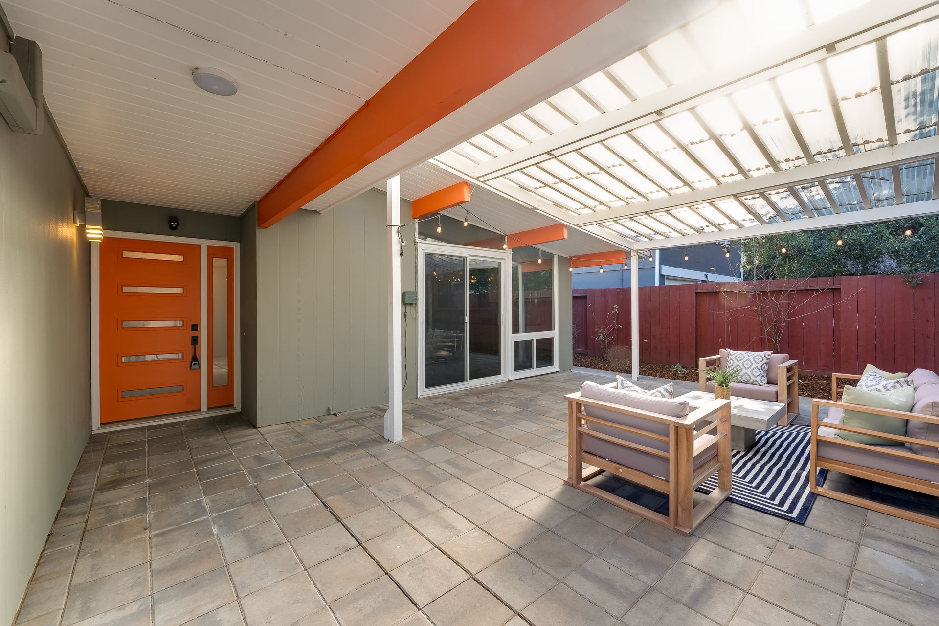 Nestled at the end of a private driveway, this thoughtfully designed 4-bedroom, 2-bath Eichler- inspired home offers 1,767 square feet of refined living space. A welcoming front atrium sets the stage for seamless indoor-outdoor living perfect for al fresco dining & social gatherings. Inside, vaulted tongue- & -groove ceilings & floor-to-ceiling windows bathe the rooms in natural light. The inviting living room features a cozy fireplace, while hardwood floors, granite countertops, & strategically placed skylights add warmth & modern style. The well-appointed kitchen boasts stainless steel appliances & a convenient walk-in pantry; sliding doors open to a pergola, extending your living space outdoors. The primary suite offers a peaceful retreat, complete with sliding doors to the yard, a spacious walk-in closet, & updated LED track lighting. The 7,560-square-foot lot showcases a spacious yard with vibrant roses, & fruit-bearing trees. Located moments from the tranquility of Cornelis Bol Park, the entertainment of CineArts Square, & the culinary scene of California Ave & within easy reach of Stanford University, Stanford Shopping Center, & major tech campuses. Top Palo Alto Public schools.