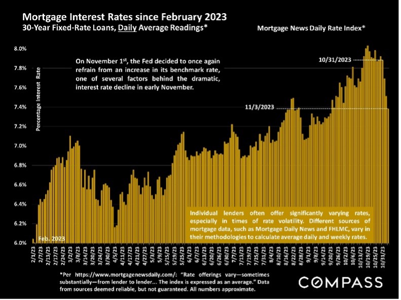 While mortgage interest rates increased dramatically in 2023, the data shows that home prices and home buyers failed to take notice. Historically low inventory with more buyers than available homes for sale caused home prices to hold relatively steady. Demand from home buyers was further driven by the resurgence of equity markets. Home buyers in Santa Clara County have traditionally worked at tech companies listed on the Nasdaq which peaked in July close to 40%, and that is now closing out the year close to those record levels.